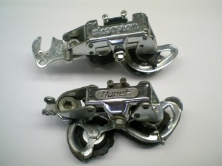 | さて、自転車に取り付けた状態で見ると、廉価ものだが、オリジナリティあふれたデザインの変速機に見える。写真を見て、プーリーケージに気がついた人は正解である。上部が伸びたような、どこかで見たことのあるような形。ユーレーと同じ形である。前方向から見るとなんと!ユーレーのチャレンジャー、エコと同じなのである。比べてみれば分かるが、パンタグラフのピンの方向は違うが、寸法は同じである。テンションスプリングやリターンスプリングの巻き数まで同じである。プーリー間の長さは違う。この点から見れば、フロントシングル、5段か6段の自転車に使われるものと推測される。 |