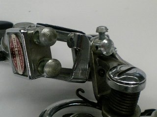 | 今回は国産のディレーラーである。もう40年程前になるだろうか?そんな製品である。まだ、カンパも鉄レコの時代である。サンツアーの上級製品でコンペティションというのがあった。これがレース用、トップノーマルである。片や、グランプリというローノーマルのものがあったが、これがツーリング用になっていた。コンペティション・ツインというのは、その点では中間に位置する。何がツインかというと、ワイヤーが二本分の長さ要るのである。 |