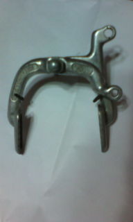 | ブレーキの残骸ということからシマノのAXまで話が転じてしまったが、今回は元に戻ってブレーキの続きである。残骸の中に写真のような東京ブレーキのサイドプルがあった。東京ブレーキといってもほとんどの人は聞いたこともないのではなかろうかと思う。ボルトナット類もなく、本体のみの残骸である。ただし、アルミ製ではある。スポーツ車のブレーキと言えば吉貝(ヨシガイ)のダイヤコンペまたはダイヤワイマンのブランドが有名であり、その他の国内メーカーを知っている人も少ないと思う。 |