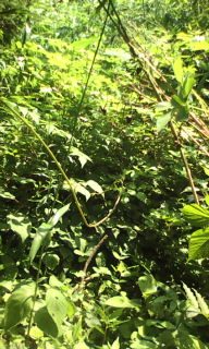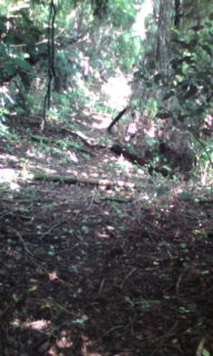 | ともかく暗い山の中をひたすら歩く。汗はかくが温度が下界とは比べものにならない。木々の間を抜け下っていくと、下で57号線のクルマの音が聞こえ始めた。このあたりから徐々に藪が深くなってきた。地面の杭も見えなくなってきた。ひざ下くらいまでだった藪が背の高さまでになり道を分からなくしている。進むのも困難になってきた。こんな所で滑落でもしたら誰も見つけてくれないだろうし、地面の状態も滑りそうな感じになってきた。今回はここまでにして、今来た道を引き返す。次回は鎌でも持ってこようかとも思った。 | |