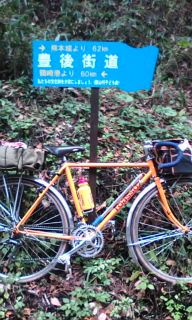 | また、熊本県側では大分県側よりも道が荒廃していないのも特筆すべき事である。県外からの人には親切だと思う。通る人もそんなに多くないであろう道に税金を使っているのは許せる。県知事もくまモンも偉い!朝夕寒くなった、この時期、スタートを少し遅らせても大分までは下りが多い。70km程、一日で行けるだろうと考えた自分が甘かった。57号線だったら行けるのだが、昔の道はそんなに単純なものではなかった。 | |