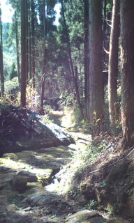 | 狭い道をアップダウンしながら進む。その内に肥後と豊後の境のすぐ手前の分岐点に着いた。ここでコーヒータイム。石畳で汗をかいていたので上着を脱ぎ涼むが、すぐに寒さを感じるようになる。山の中で一人、昔の人の苦労を偲んでみた。その頃には旅人用の茶屋か何かあったのかもしれない。時計を見るとここまでに思った以上の時間を費やしている。走り始めるものの、国境を示す表示があるはずだが見当たらない。見過ごしたのかどうか、三本松の集落に辿りついてしまった。 | |