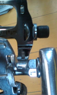 | ペダルそのものを見ていると実に造りが単純である。鉄板とアルミ板の組み合わせ。一度カンパを使い始めるとその幼稚さには見向きもしなくなった。回転部のスムーズさ、転倒してもガタ一つこないその造りに心酔した。今になって言うが、リオタードのアルミラットトラップペダルを昔、一時期、ツーリング車に使っていた事がある。ところがそのカシメ強度の弱さ、ちょっとぶつけただけでプレートが片側外れてしまった。本体のバレル部分も手で回るようになった。結局、すぐに元の鉄のラットトラップに戻してしまった。まあ、カンパと比べて当時でも価格差は4倍以上あったのだから仕方がないと言えばそれまでなのだが、リオタードの印象はあまり自分にとってはよくなかった。 | |