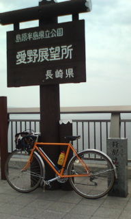 | 今回は極オーソドックスに海岸線を反時計回りに回る事にして、朝8時半のフェリーで熊本港を出発した。出港前に駆け込んできた自転車が一台、神奈川から来た人で鹿児島から九州北部を回っているとの事、青のフェルトのロードバイクで軽装である。1時間後に島原に到着、そこで分かれてこちらは北上する。意外と調子いいと思って走っていると何と追い風、西側に入ると向かい風が待っているはずである。愛野展望台で昼食と思っていたが、それには少しばかり早い。そのまま小浜に向かう。 |